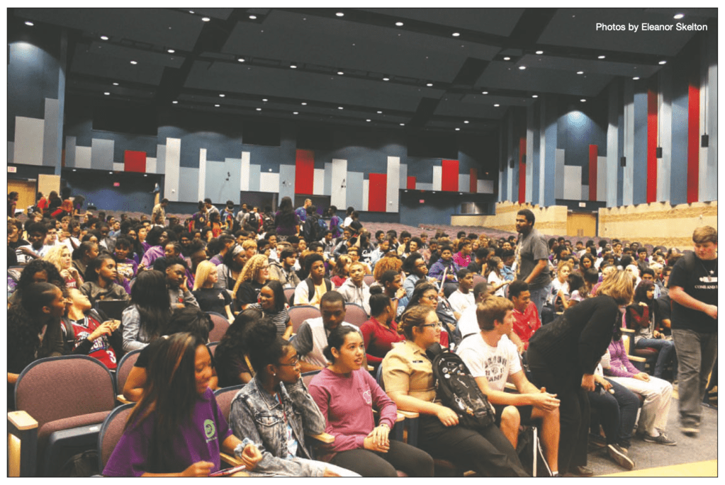 Students filed into the auditorium for the assembly, chatting and laughing.