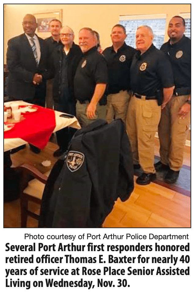Several Port Arthur first responders honored retired officer Thomas E. Baxter for nearly 40 years of service at Rose Place Senior Assisted Living on Wednesday, Nov. 30.