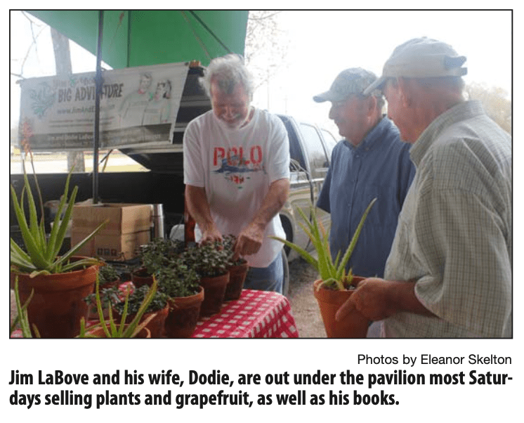 In the meantime, Jim LaBove and his wife, Dodie, are out under the pavilion most Saturdays since the first of the year selling plants and grapefruit, as well as his books Cotton’s Seafood and Sketches of My Cajun Life.