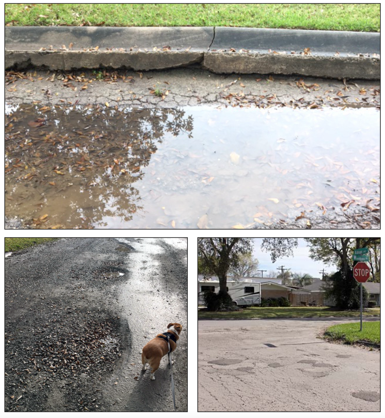(Left) Cracked curbs and and broken asphalt on Woodlawn Street in Groves, looking towards 32nd Street. (Right) Drainage issues at the intersection of Woodlawn Street and Allison Avenue | Photos: Eleanor Skelton and Jennifer Jackson
