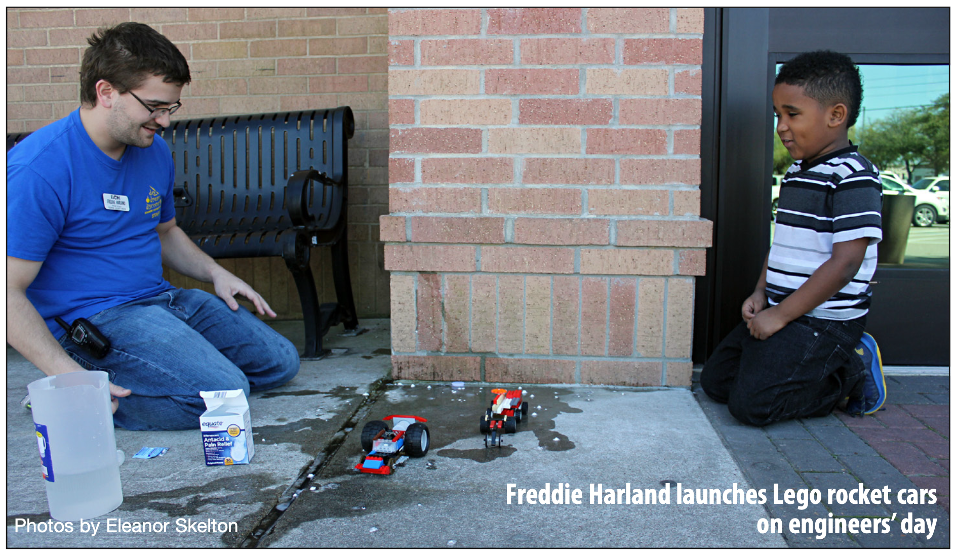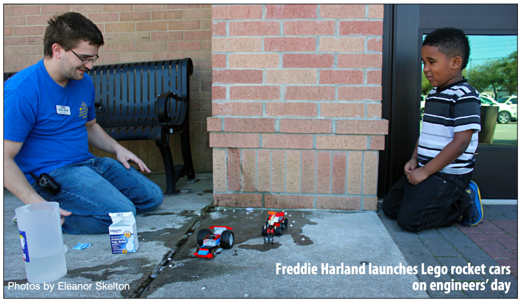 Harland designed most of the activities, hoping to teach science while having fun. He carefully placed Alka Seltzer tabs in water held inside a plastic film canister, then loaded it onto a lego car against a brick wall to teach kids about rocket propulsion.
