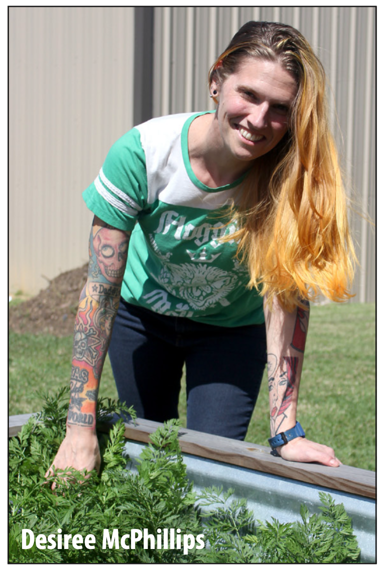 (Left) Mid-County Victory Garden, located behind Shear Madness Hair Salon on Nederland Avenue. (Right) The garden’s founder, hairstylist Desiree McPhillips poses with the vegetables she is growing. | Photos by Eleanor Skelton