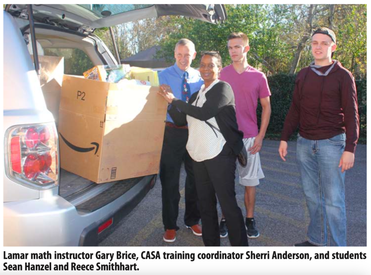 Brice and two of his students unloaded several boxes of toys and a large stuffed bear at CASA’s downtown office off Calder Avenue on Dec. 11. CASA stands for Court Appointed Special Advocates and is a national association that supports and promotes court-appointed advocates for abused or neglected children in order to provide children a safe and healthy environment in permanent homes.