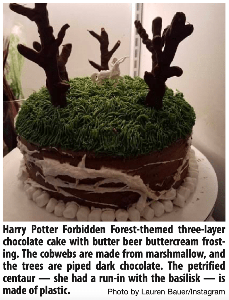 Bauer’s stories-come-to- life edible creations aren’t just ideas on paper — they made a Forbidden Forest cake earlier this year for a coworker’s birthday, complete with butter