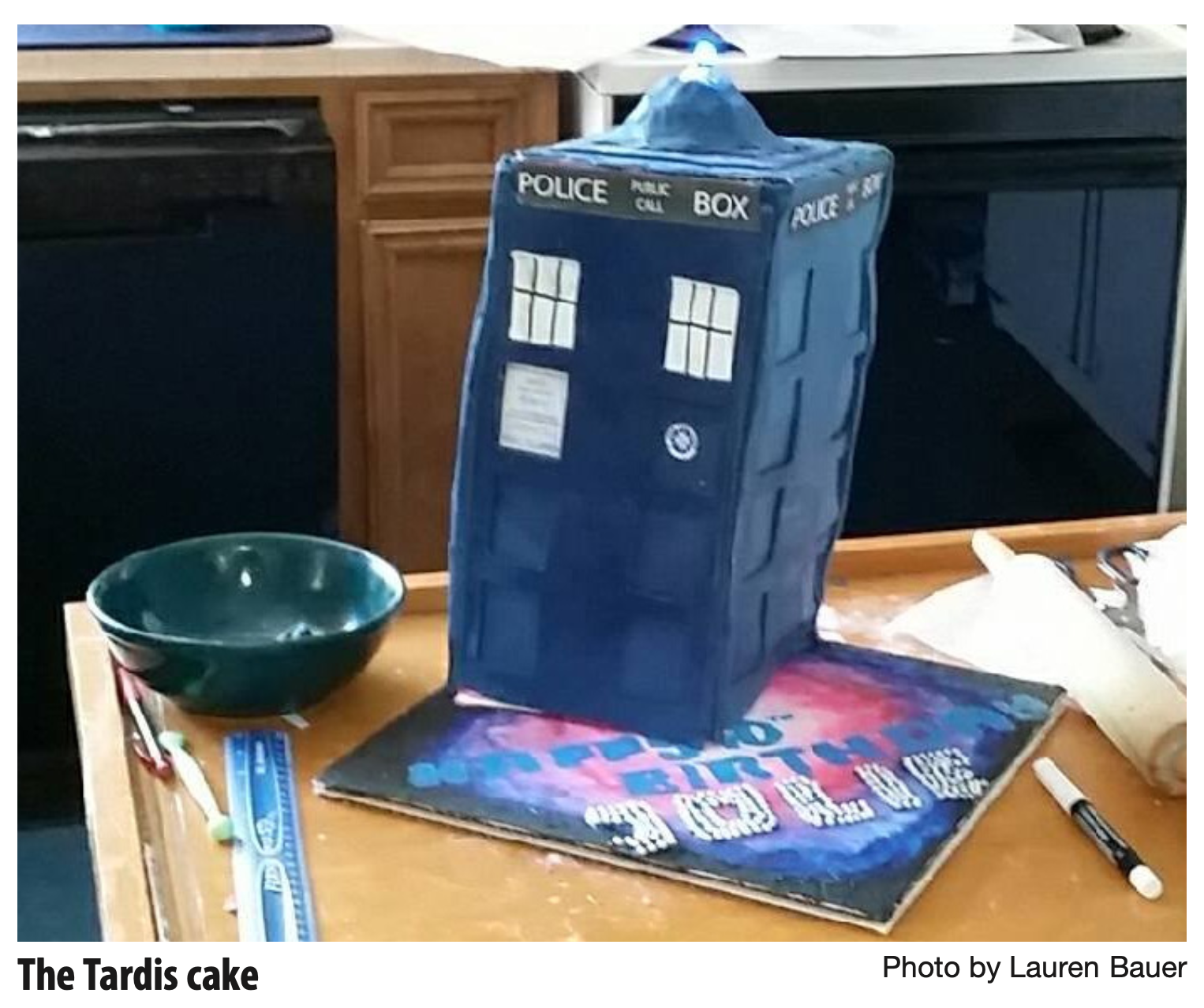 Bauer said they marbled the inside of the cake teal blue and royal purple with bright pink raspberry buttercream frosting, all covered in “Tardis blue” modeling chocolate. Using modeling chocolate adds to the flavor in a way that fondant icing doesn’t, they said.