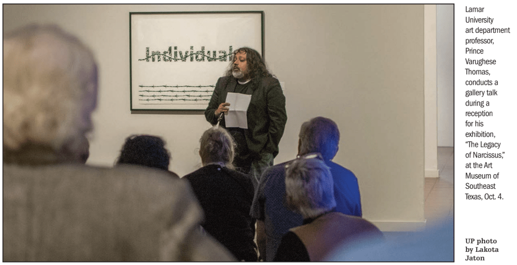 At a reception, Oct. 4, Thomas, a professor in Lamar University’s art department, said his work asks questions about social media, egotism and politics that do not have immediate answers. The answers, he said, are up to the viewer.