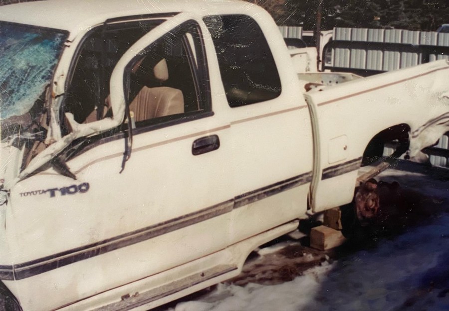 The second picture is just after my dad’s wreck on January 26, 2000. Three months after moving to Western Colorado, he was driving alone on US 550 leaving Ouray to pick up the mail in Ridgway. It had been raining and snowing off and on all day, turning the road into slush. The truck’s back wheels broke loose, spinning head on into an 18 wheeler. We later learned this turn on US 550 is banked towards the Uncompahgre River and was nicknamed Tuffy’s Corner for the county undertaker. My dad’s truck hit the semi’s front and kept sliding, hitting the wheels, then the mountainside before stopping. If he had missed the wheels, the truck would have gone under the trailer, which is usually fatal.