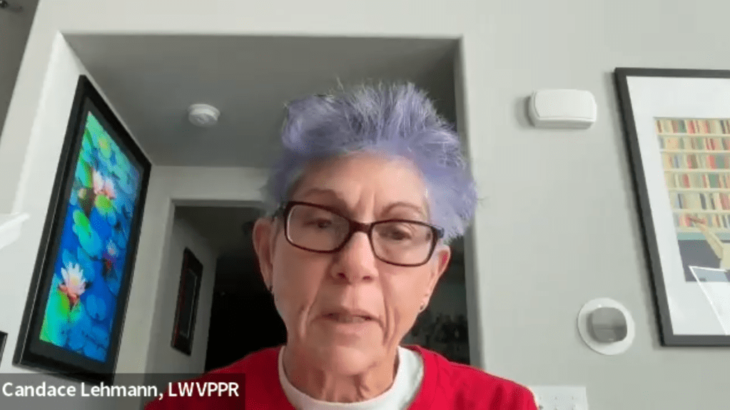 Former D49 school board candidate Candice Lehmann reminded the attendees that The League of Women Voters has been a nonpartisan grassroots organization whose goal is to ensure everybody is represented in our democracy for the last 105 years.